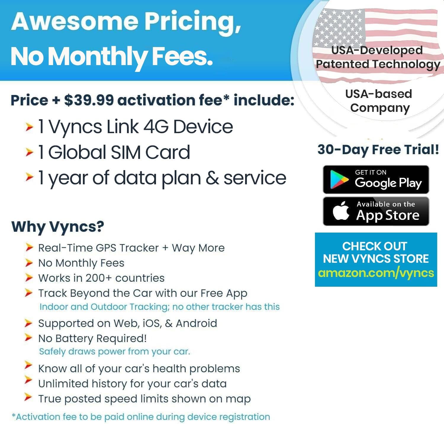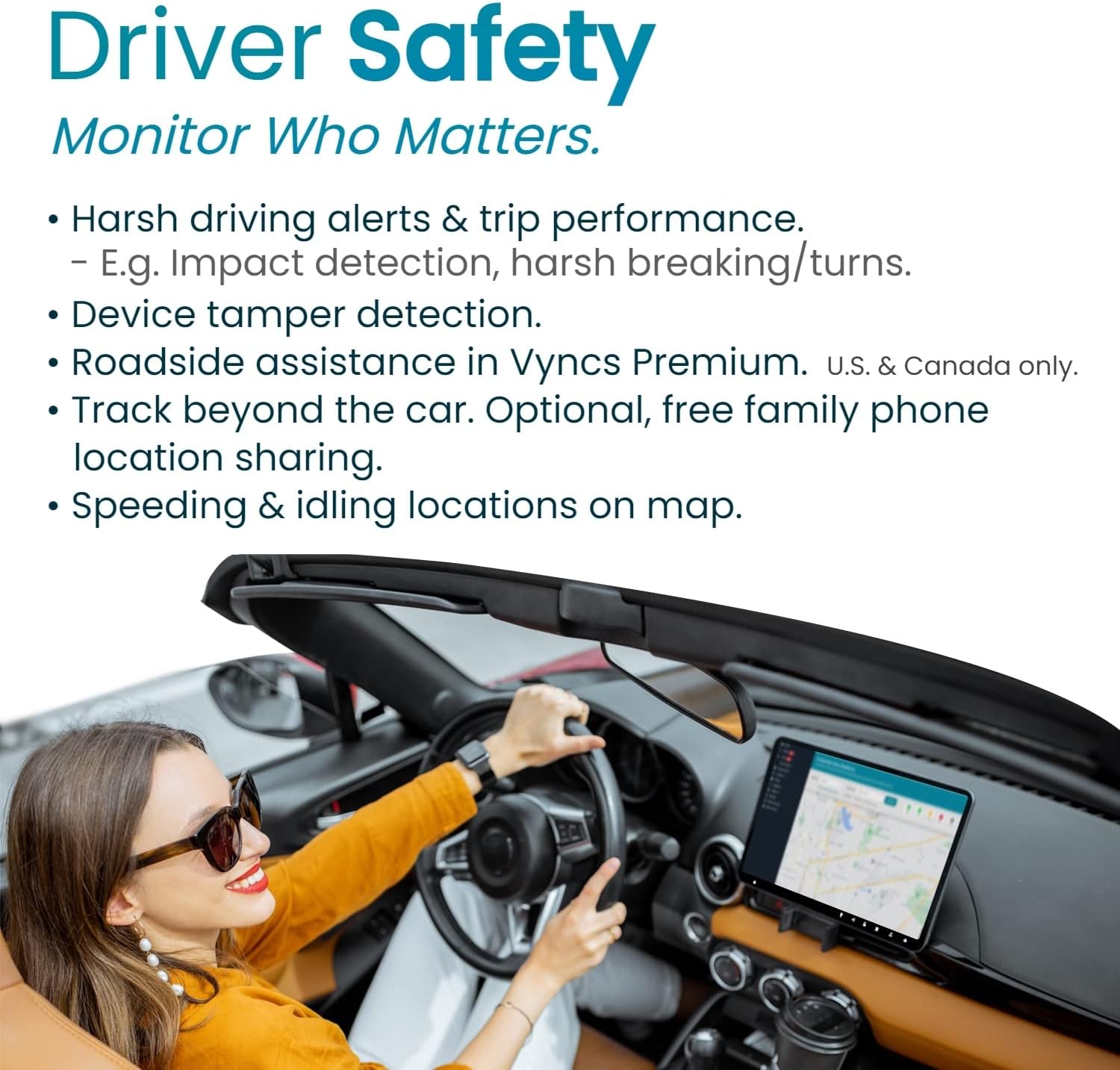 Vyncs – GPS Tracker for Vehicles, [No Monthly Fee], 4G LTE, Vehicle Location, Trip History, Driving Alerts, GeoFence, Fuel Economy, OBD Fault Codes, USA-Developed, Family or Fleets